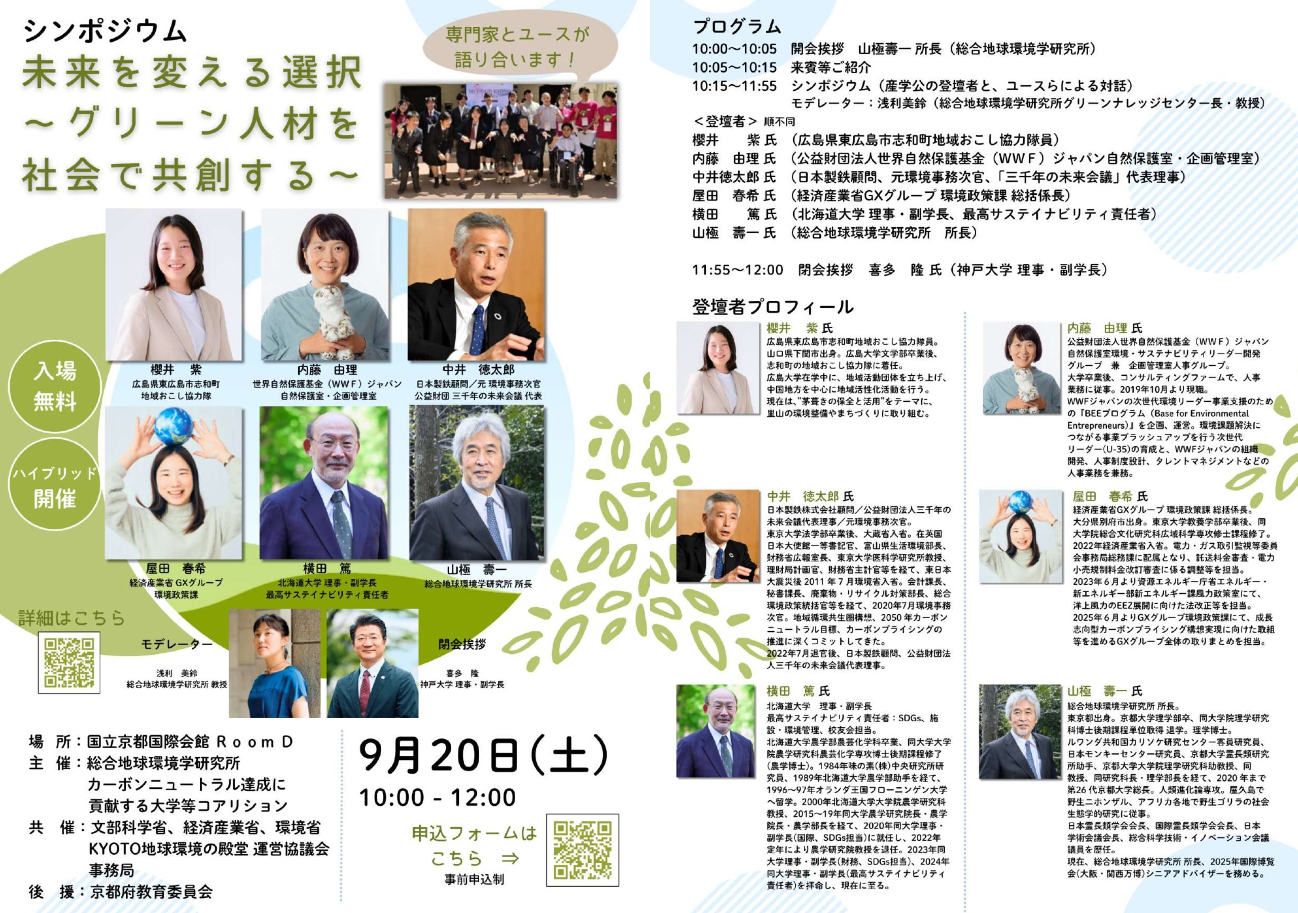 そこで、実際にグリーン人材として活躍する産学公民の前線・現場の方々とともに、それを目指すユースからの「問い」や「提案」も受け、対話の中で深化させる場として開催いたします。